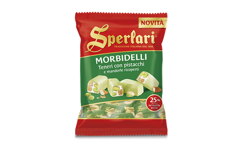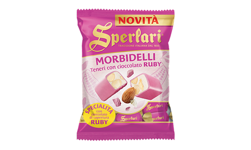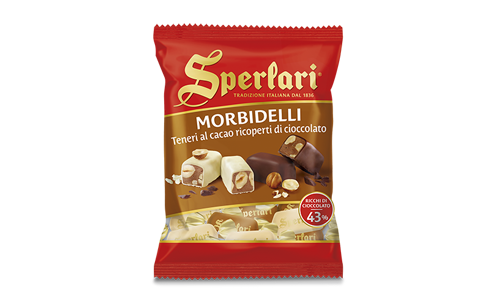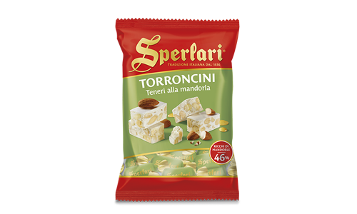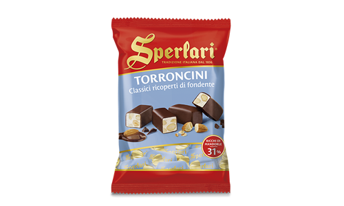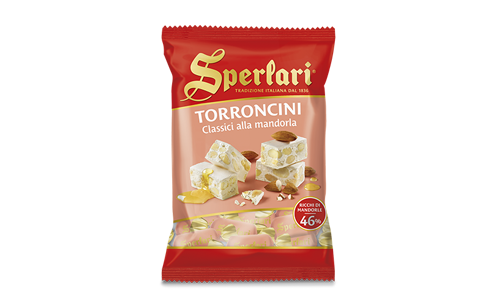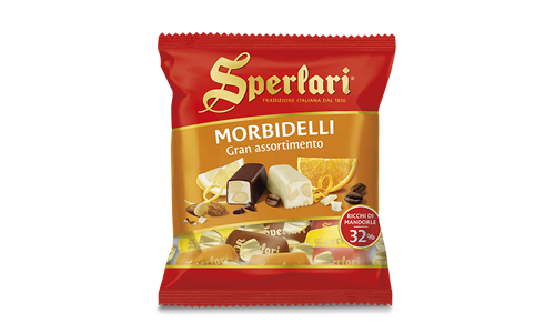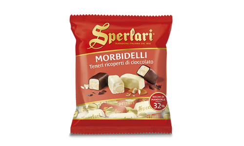 Sperlari® soft nougat pieces, packed with crunchy, fragrant almonds (32%), with subtle citrus notes, covered with white or dark chocolate.